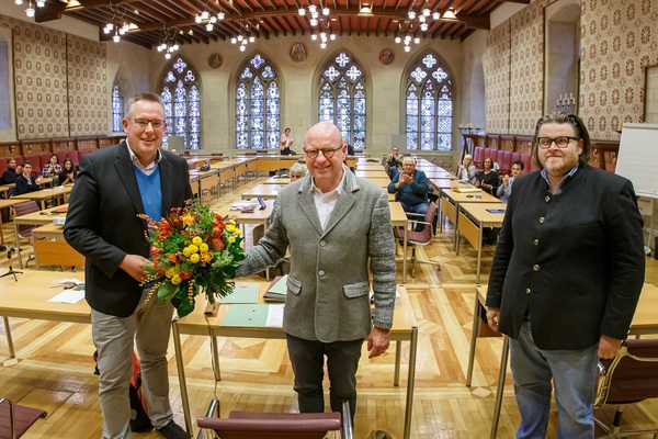 Blumen für den alten und neuen Oberbürgermeister Markus Lewe gab es in der CDU-Fraktion am Montagabend vom CDU-Ratsfraktionsvorsitzenden Stefan Weber (links) und dem CDU-Parteivorsitzenden und neugewählten Ratsherrn Hendrik Grau (rechts).