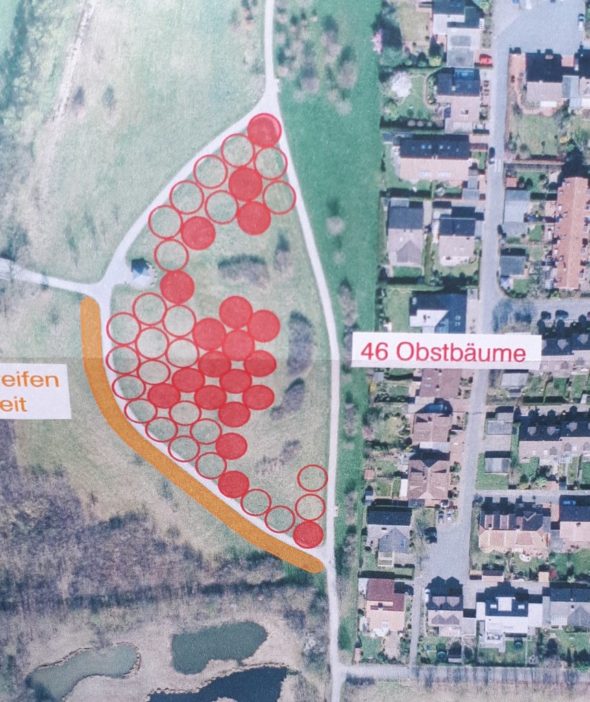 Das Amt für Grünflächen, Umwelt und Nachhaltigkeit befürwortet die Anpflanzung von alten und lokalbewährten Obstbaumsorten im Offerbach-Park und die Einbindung von engagierten Bürger-/innen und Vereinen in die – nach Ablauf der dreijährigen Feststellungs- und Entwicklungspflege – dauerhafte Unterhaltungspflege der Obstbaumwiese.