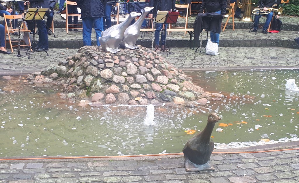 In einer Einweihungsfeier wurden, nach dem Diebstahl im Januar 2020, am Sonntagmorgen die neuen Gänseskulpturen in Albachten aufgestellt und eine ergänzende Hinweistafel angebracht.