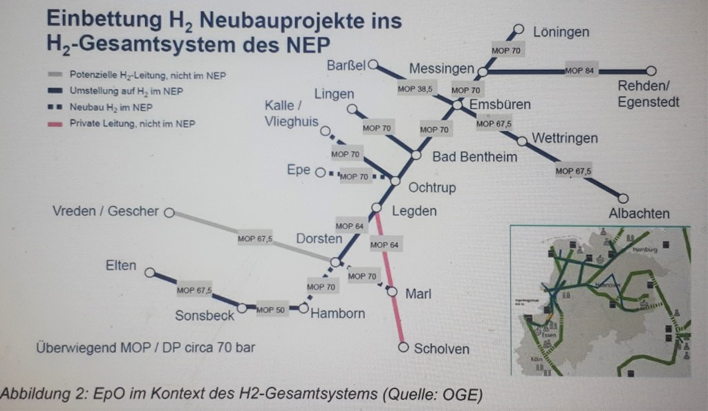 Bis 2030 soll mit rund 1.100 Kilometer Pipeline maßgeblich in Niedersachsen und Nordrhein-Westfalen der Start für ein deutschlandweites Wasserstoffnetz mit Anbindung an die Niederlande gelegt werden. Hierzu können vorrangig ausgewiesene Korridore oder bereits vorhandene Fernleitungen genutzt werden. Open Grid Europe hat dazu ein Raumordnungsverfahren beantragt. Die formelle Durchführung des Raumordnungsverfahrens ist ab Frühling / Sommer 2022 geplant.
