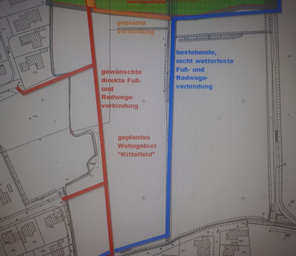 Die bloße Anbindung an die behelfsmäßig angelegte, nicht immer wetterfeste Fuß- und Radwegeverbindung, bedeutet jedoch einen Umweg für alle Fußgänger und Radfahrer. Angesichts der künftigen Bedeutung der Verbindung für die Erschließung des gesamten Waldwegviertels wünschen wir eine direkte, wetterfeste und gut erreichbare Verbindung.