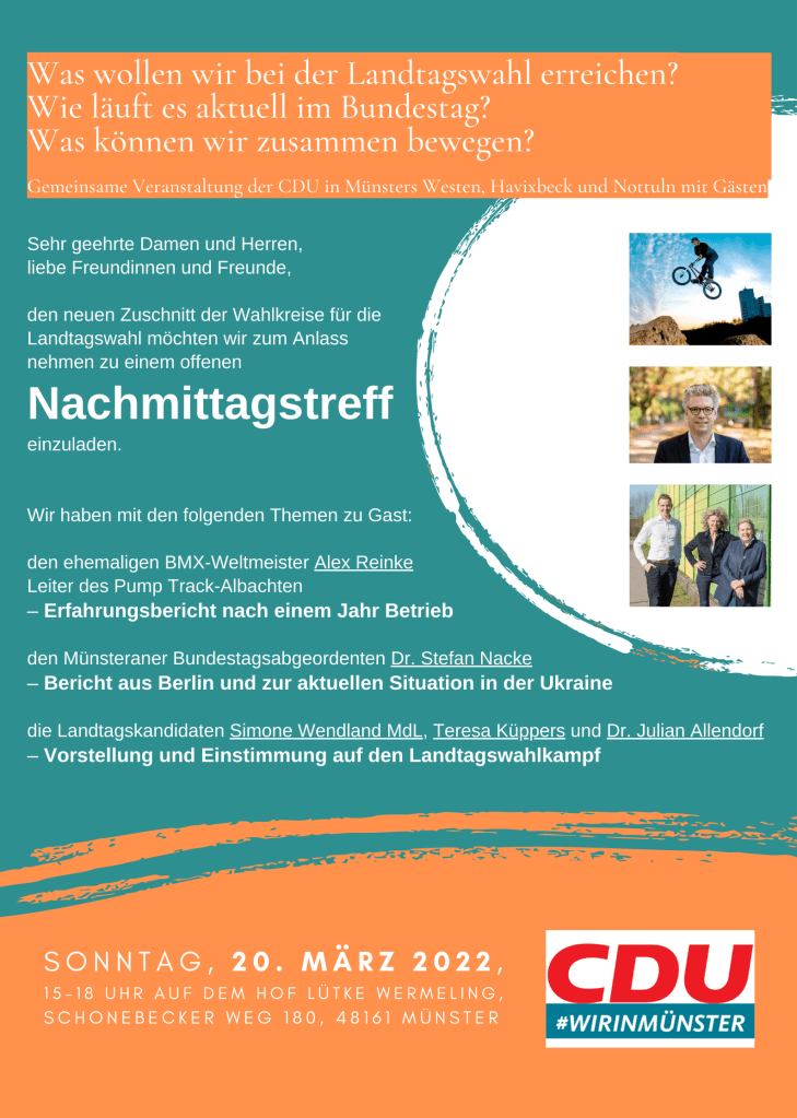 den neuen Zuschnitt der Wahlkreise für die Landtagswahl möchten wir zum Anlass nehmen, gemeinsam mit den Ortsunionen aus Münsters Westen zu einem offenen Nachmittagstreff einzuladen.