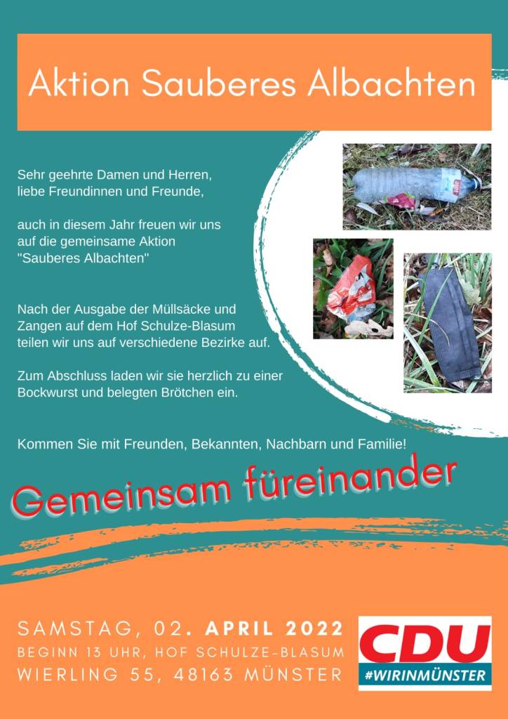 Aktion „Sauberes Albachten“ Verfasst vonpeterwolfgarten27. März 202227. März 2022Veröffentlicht inAllgemein Aktion Sauberes Albachten Packt gemeinsam mit an! Teilen mit: Klicke, um auf X zu teilen (Wird in neuem Fenster geöffnet) X Klick, um auf Facebook zu teilen (Wird in neuem Fenster geöffnet) Facebook Gefällt mir Wird geladen … Ähnliche Beiträge