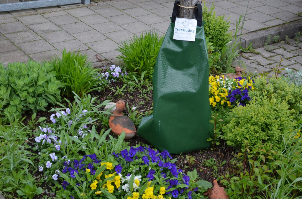 Um die Infrastruktur, die den „Baumkeepern“ die Arbeit erleichtert, kümmert sich die Stadt. Das Wasser aus den großen Tanks, können die „Baumkeeper“ auch nutzen, um die Wassersäcke zu befüllen, die das Grünflächenamt in den nächsten Tagen an rund 600 Bäumen im Umfeld der Wassertanks befestigt. Die Säcke fassen etwa 75 Liter Wasser und haben den Vorteil, dass sie ihren Inhalt tröpfchenweise abgeben, so dass das Wasser nicht oberflächlich abfließt und auf jeden Fall bis an die Baumwurzeln vordringt. Die Wassertanks werden in einem Rhythmus von 14 Tagen automatisch wieder aufgefüllt werden, das notwendige Wasser stellen die Stadtwerke zur Verfügung. Wenn eine Nachbarschaft sich engagieren möchte, aber in ihrem Umfeld keinen Wassertank ansteuern kann, so kann das Grünflächenamt für die Bewässerung von zehn oder mehr Bäumen die Wassersäcke frei Haus liefern.