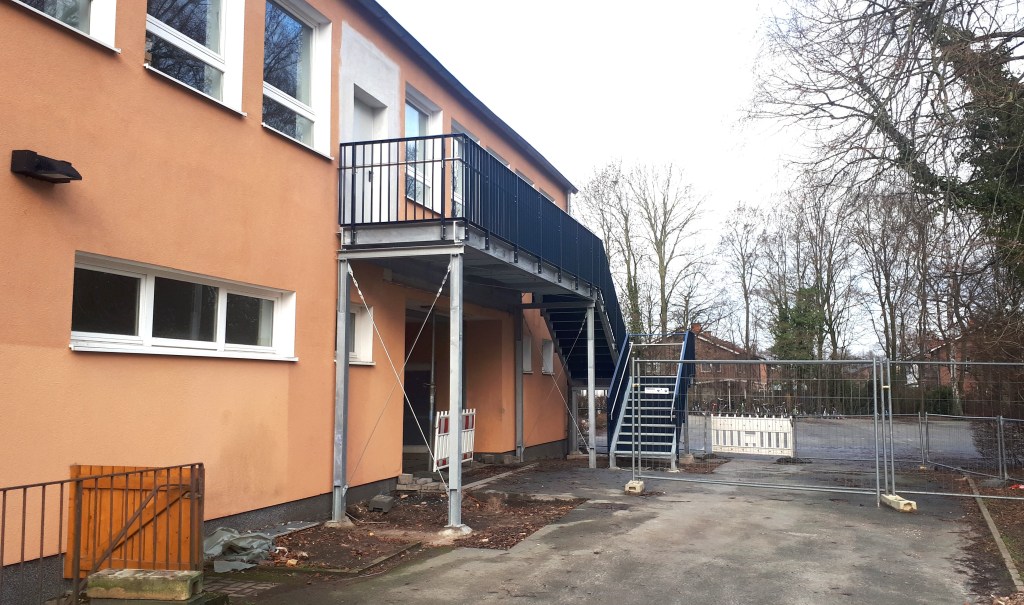 Für den zweiten baulichen Rettungsweg war der Rückbau des Vordachs über dem Haupteingang ebenso wie die Errichtung einer neuen Stahltreppe mit neuer Fluchttür, Umbau des Flurbereichs im Obergeschoss notwendig.