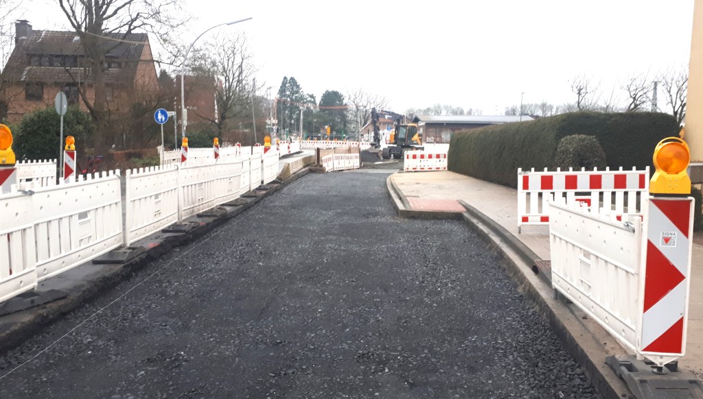 Die Brücke über den Getterbach ist auf der östlichen Seite bereits jetzt fertiggestellt. Das Straßenstück über dem neu errichteten Teilstück der Getterbachbrücke kann aus Temperaturgründen zur Zeit jedoch noch nicht asphaltiert werden. Dies soll in der 9. Kalenderwoche erfolgen. Eine Sperrung der Heroldstraße wird zu diesem Zeitpunkt wahrscheinlich nicht erfolgen. Diese erfolgt jedoch im Sommer beim Kreuzungsausbau mit der Straße Am Getterbach.