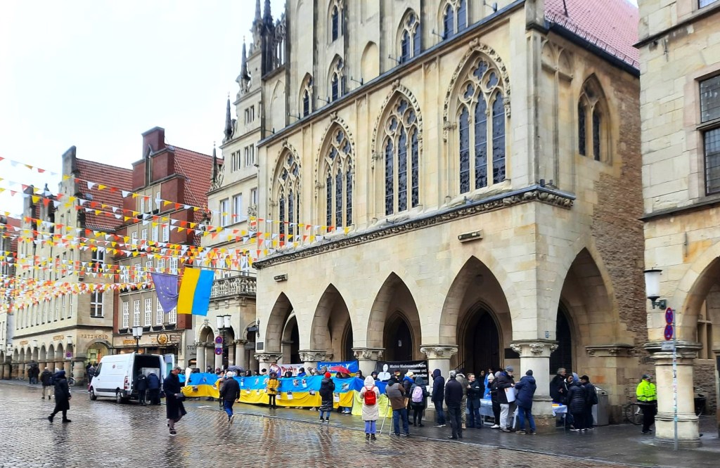 Münster (SMS) „Mit Zuversicht verfolge ich aus Berlin, wie sich heute, an diesem traurigen Jahrestag des russischen Angriffs auf die Ukraine, das Mitgefühl der Münsteranerinnen und Münsteraner in vielfältigen zivilgesellschaftlichen Aktionen ausdrückt, die der Kriegsopfer gedenken, sich solidarisch zeigen und für Frieden einstehen“, sagt Münsters Oberbürgermeister Markus Lewe. „Ich danke allen Beteiligten von Herzen für dieses tatkräftige Engagement und wünsche den Initiativen gutes Gelingen. Mein Dank gilt auch Bürgermeisterin Stähler, Bürgermeisterin Winkel und Bürgermeister Rosenau, die mich vor Ort in Münster vertreten.“