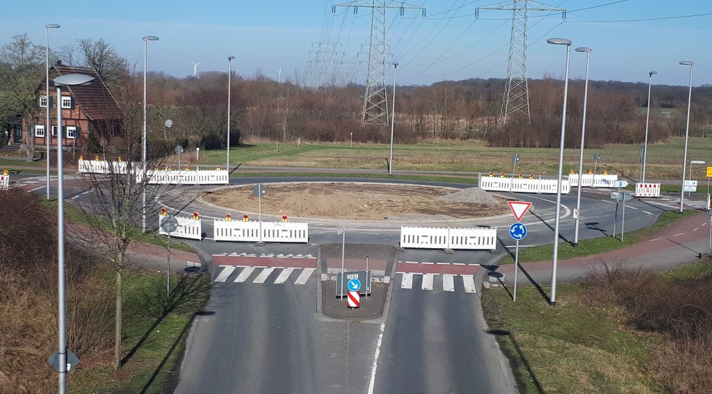 Nachdem die BV West in der Sitzung am 28.04.2022 der Umgestaltung des Kreisverkehr zugestimmt hat laufen nun die Umbauarbeiten. Der Erdhaufen im Kreisverkehr wurde zwischenzeitlich abgetragen. Nun erfolgt die Umsetzung der naturnahen Gestaltung des Kreisverkehrs mit dem Kunstobjekt „Meckelbachwelle“ als Übergang in den Landschaftsraum der Aa.