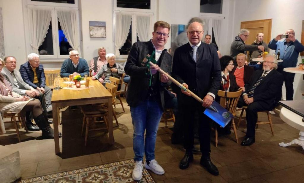 Besonders betonte Lewe die Bedeutung des großen bürgerschaftliches Engagements und gesellschaftlichen Zusammenhalts in Münster, insbesondere auch in Krisenzeiten, wie während des Hochwassers, der Corona-Pandemie und jetzt während des Ukraine-Kriegs. „Viele Mecklenbecker engagieren sich in besonderer Weise ehrenamtlich für ihren Stadtteil und ihre Mitmenschen.“, so Lewe. Oberbürgermeister Markus Lewe warb auch noch einmal für den gemeinsamen Musik-Campus von Stadt und Universität als neues, in der geplanten Form einmaliges identitätsstiftendes Projekt für die ganze Stadt. Damit er die vielen angesprochenen Zukunftsprojekte der Stadt auf den Weg bringen könne, überreichte Ulrich Möllenhoff dem Oberbürgermeister im Anschluss an seine Rede symbolisch einen Spaten.