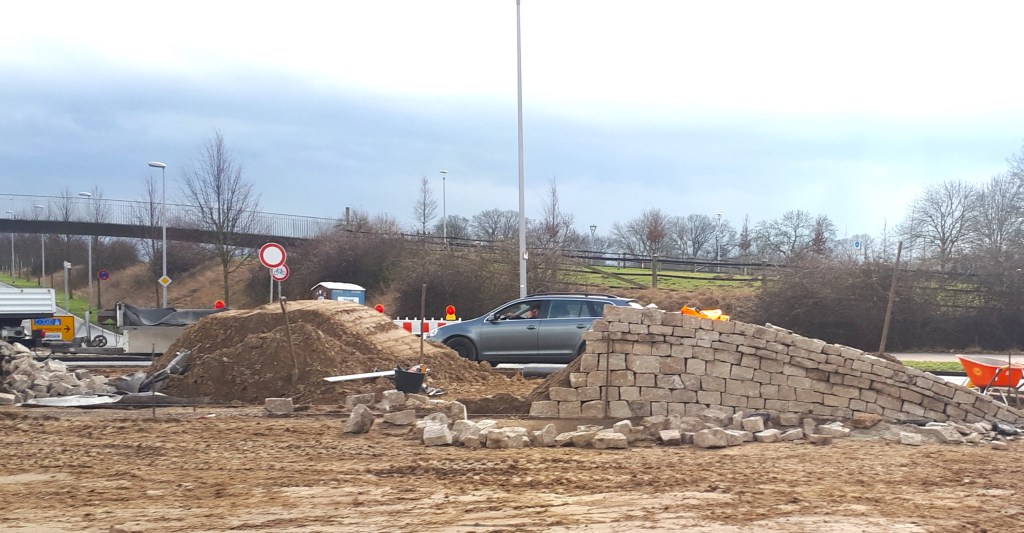Einen Teil der künftigen wellenförmigen naturnahen Trockensteinmauer kann man schon jetzt erkennen. Die Wellenform stellt symbolisch den Bezug zum Meckelbach und zur Aa als den prägenden Landschaftsraum in Mecklenbeck dar.