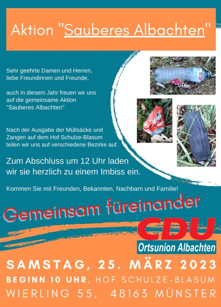 Auch in diesem Jahr freuen wir uns auf die Aktion „Sauberes Albachten“.