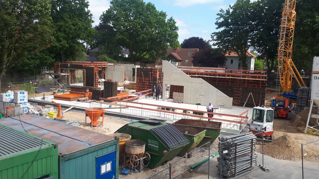 Im Januar war Baubeginn, heute (01.06.23) erfolgte die Grundsteinlegung für die neue PTA-Schule am Schürbusch 47. Keller und Bodenplatte des Neubaus sind fertig, einige Mauern des Erdgeschosses stehen auch schon.