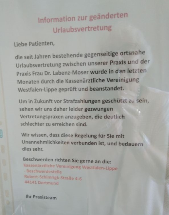 Auf meinen Brief an die KVWL bekam ich die Antwort, dass bei der kollegialen Vertretung es zwangsläufig auch zur Behandlung desselben Patienten in mehr als einer Praxis und somit zu sogenannten „Patientenidentitäten“ und – wie im Fall Mecklenbeck – dann zu einer eingehenden Plausibilitätsprüfung durch die KVWL kommt.