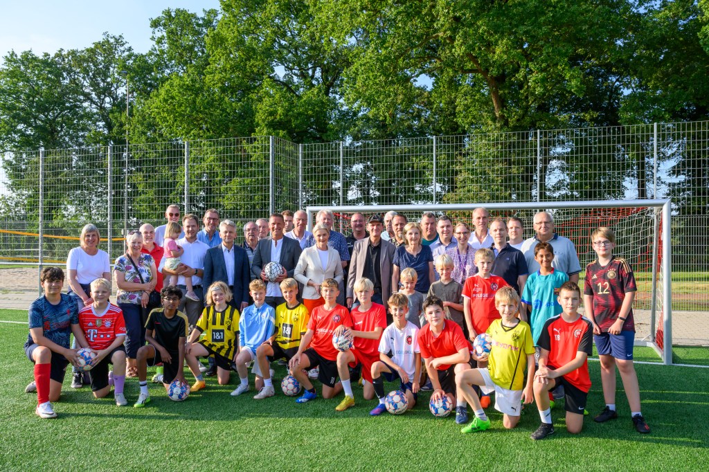 Bild: Gemeinsam mit dem Vereinsvorsitzenden Jürgen Bergs (mit Ball) haben Stadtdirektor Thomas Paal (links davon), Bürgermeisterin Angela Stähler (rechts davon) den neuen Kunstrasenplatz der kommunalen Sportanlage des SV Concordia Albachten 1955 e.V. offiziell eingeweiht. Foto: Stadt Münster/Michael Möller.