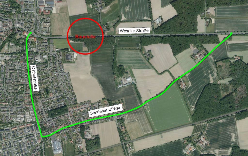 Um Raum für Abbiegerspuren und Bushaltestellen zu gewinnen, wird die Weseler Straße in diesem Bereich verbreitert und ein Stück in Richtung Norden verlegt. Außerdem wird eine Baustraße, die zwischen Weseler Straße und Sendener Stiege durch das Baugebiet führt, errichtet. Die Bauarbeiten sind voraussichtlich im September 2024 abgeschlossen. Witterungsbedingt kann sich der Zeitplan verschieben.