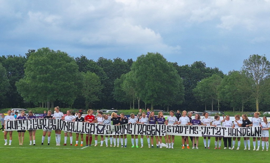 Die 1. Frauen-Mannschaft der DJK Wacker Mecklenbeck hielt sich nach dem Aufstieg und dem Pokalsieg gegen die DSC Arminia Bielefeld erst gar nicht lange mit den Feierlichkeiten auf, sondern forderte deutlich einen zweiten Kunstrasenplatz; Stadt Münster jetzt handeln!