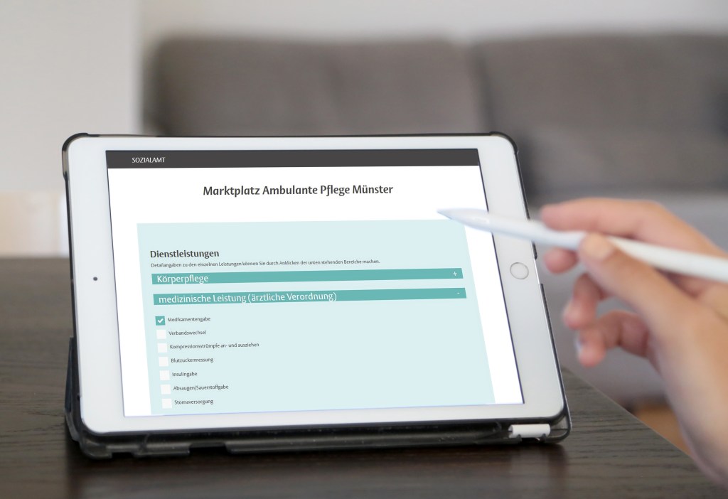 Die digitale Angebotsplattform „Marktplatz ambulante Pflege Münster“ des städtischen Sozialamtes ist in Zusammenarbeit mit dem Verein „Starke Pflege in Münster“, dem Arbeitskreis der ambulanten Pflegedienste sowie dem städtischen IT-Dienstleister citeq entstanden.