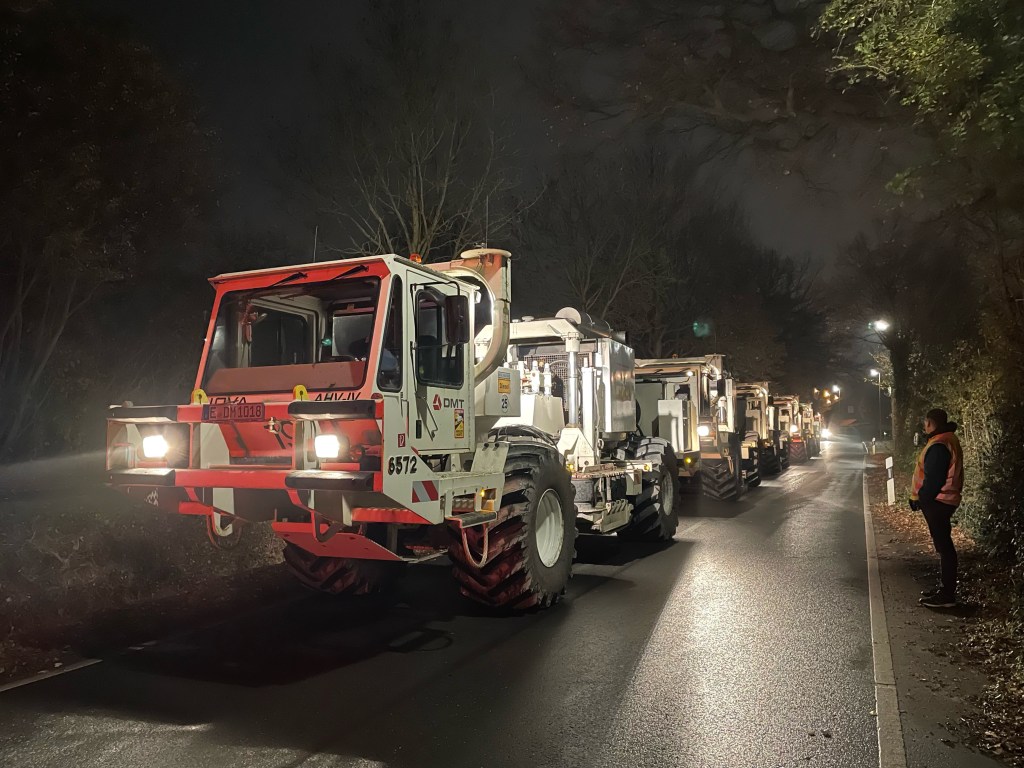 Ab Sonntagabend (17.11.) fahren Vibrotrucks nun auch durch Albachten, später in der Woche auch in Mecklenbeck. Da die genauen Fahrtrouten jeweils vom Fortschritt der vorherigen Nacht abhängen, sind im Vorfeld keine exakten Auskünfte dazu möglich, wann genau die Vibrotrucks auf einer Straße oder Nachbarschaft unterwegs sein werden. Die Vibrotrucks sind sechs Nächte die Woche zwischen 19 und 7 Uhr unterwegs. In der Nacht von Samstag auf Sonntag fahren die Vibrotrucks nicht.