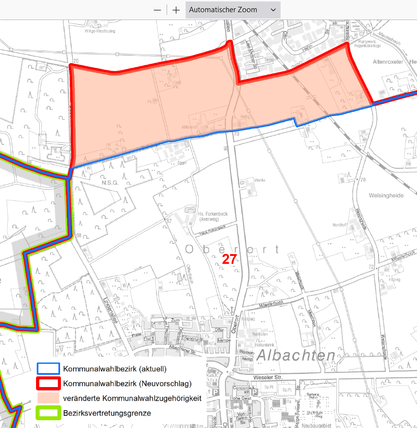 Entsprechend der gesetzlichen Vorgaben wird der Kommunalwahlbezirke 27 Albachten (-15%-Abweichung) vergrößert. Der Kommunalwahlbezirke 29 Roxel wird entsprechend verkleinert.