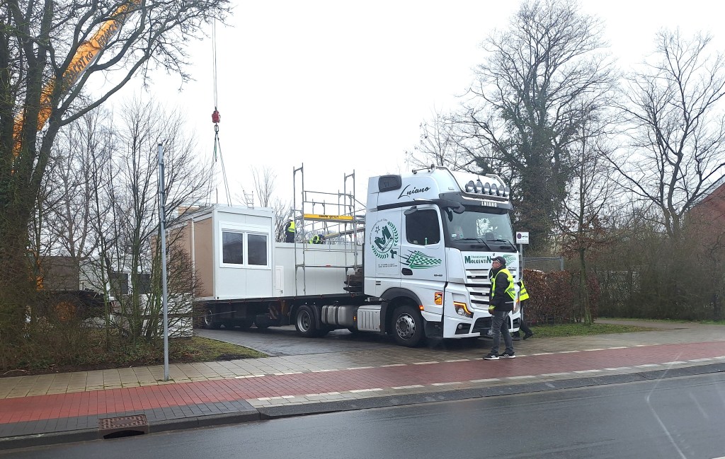 Gestern wurden die Container für die vier Übergangsräume an der PWS am Dingbängerweg aufgestellt. Mit einem großen Kran wurden die 10 Elemente für die beiden Etagen passgenau zusammengefügt.