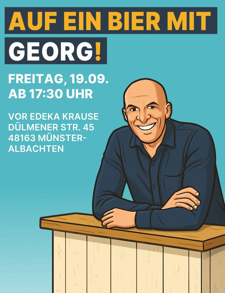 Auf ein Bier mit Georg Verfasst vonpeterwolfgarten17. September 2025Veröffentlicht inAllgemein Wir sehen uns am Freitag, 19.09.2025 ab 17:30 Uhr, vor EDEKA Krause in Albachten auf ein Bier mit Georg! Teilen mit: Klicke, um auf X zu teilen (Wird in neuem Fenster geöffnet) X Klick, um auf Facebook zu teilen (Wird in neuem Fenster geöffnet) Facebook Gefällt mir Wird geladen … Ähnliche Beiträge