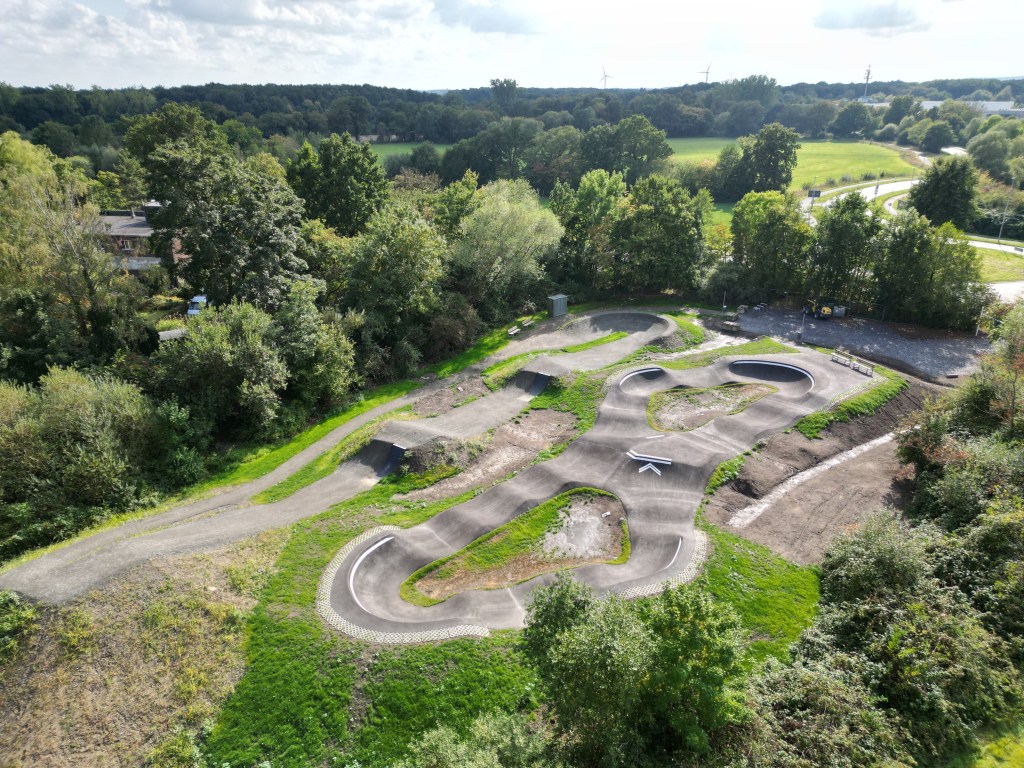 Luftbild: Das neu gestaltete Areal auf dem ehemaligen „Landfahrerplatz“ an der Steinfurter Straße verfügt über eine Dirtpark- und Pumptrack-Anlage. Foto: DSGN CONCEPTS.