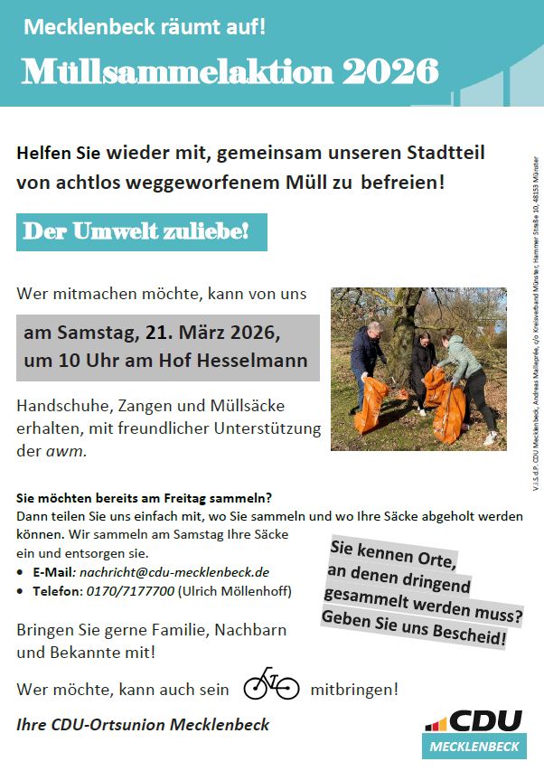 Wer möchte, kann auch schon am Freitag sammeln. Dazu können Sie Ulrich Möllenhoff mitteilen, wo Sie sammeln und wo Ihre Abfallsäcke von der CDU abgeholt werden können (per E-Mail: nachricht@cdu-mecklenbeck.de oder unter der Telefonnummer: 0170/7177700). Die CDU nimmt auch gerne Hinweise auf verschmutzte Orte im Stadtteil entgegen, an denen dringend gesammelt werden sollte, um die Lebensqualität im Stadtteil zu erhöhen.